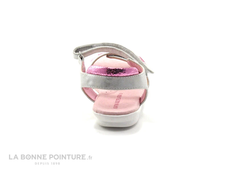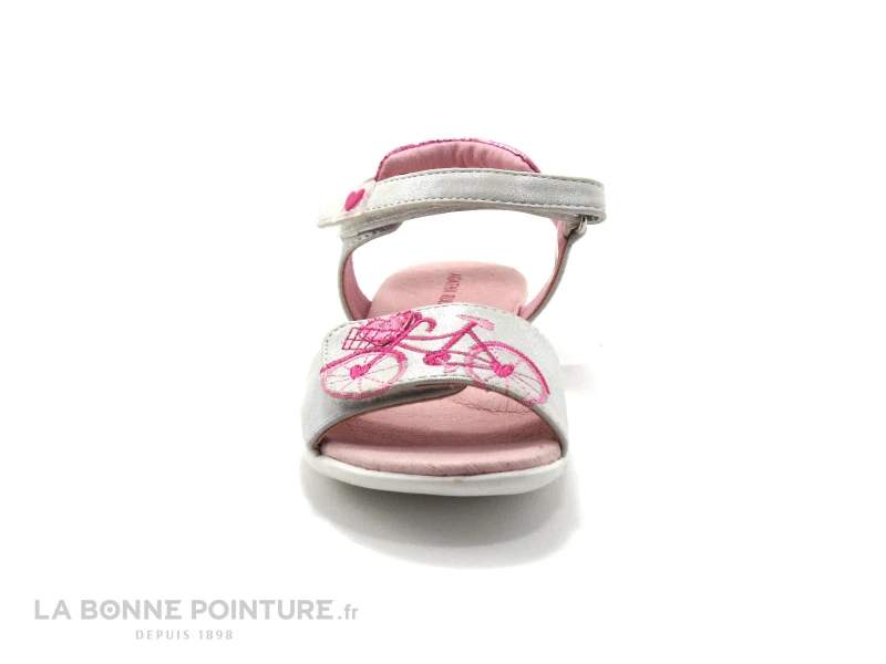 Cette sandale d’Ă©tĂ© est gris mĂ©tallisĂ©, avec un empiècement rose mĂ©tal Ă l’arrière, un un vĂ©lo (rose aussi !) brodĂ© sur le devant.
