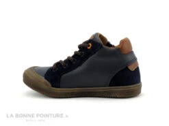 Cette chaussure montante Bellamy mĂ©lange cuir lisse et cuir velours bleu marine, avec un peu de marron clair Ă l’arrière.
