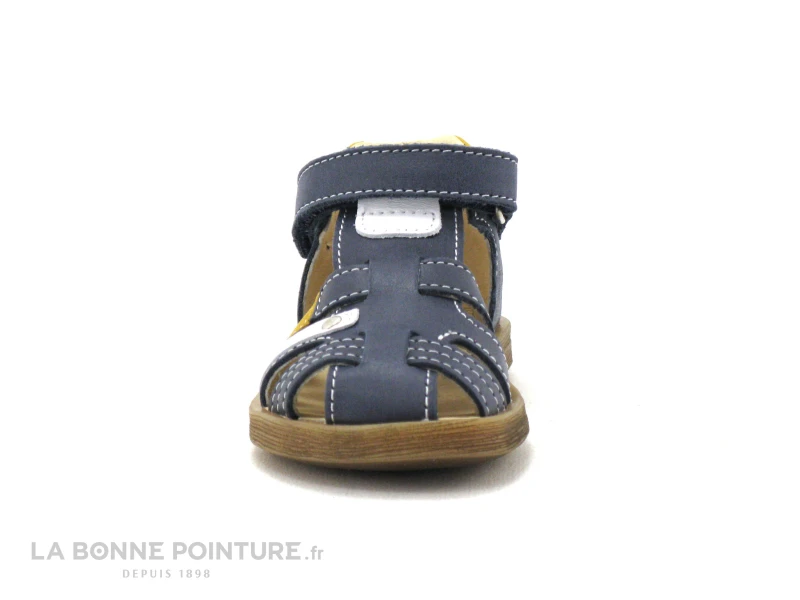 Ce nu-pieds garçon bout fermé est en cuir bleu marine, avec un peu de jaune moutarde et de blanc.