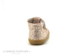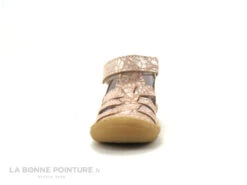 Fabriquée dans un cuir très souple, la sandale bébé fille Bellamy propose un joli coloris rose parsemé de petits dessins géométriques blanc et or.
