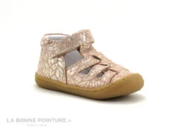 Fabriquée dans un cuir très souple, la sandale bébé fille Bellamy propose un joli coloris rose parsemé de petits dessins géométriques blanc et or.