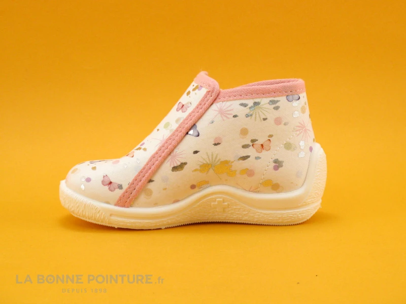 Cette pantoufle enfant fabriquée en France est en textile blanc et rose, avec plein de petits papillons qui virevoltent.