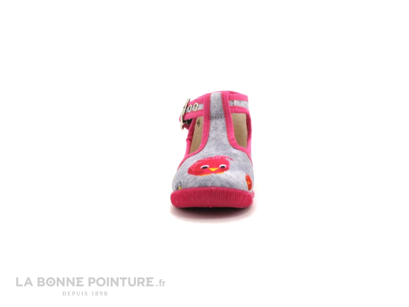 Ce chausson fille est en toile grise, imprimée de petits oiseaux multicolores. Le biais rose fuchsia sur le pourtour apporte un jolie finition.