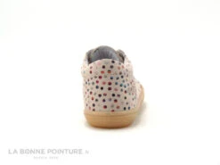 Cette chaussure montante bébé est en cuir très souple, aspect velouté rose clair (rose bubble) et parsemé de petits pois multicolores.