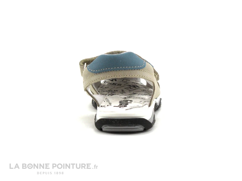 Ce nu-pieds garçon avec scratch combine un cuir velouté beige et un cuir bleu jeans.