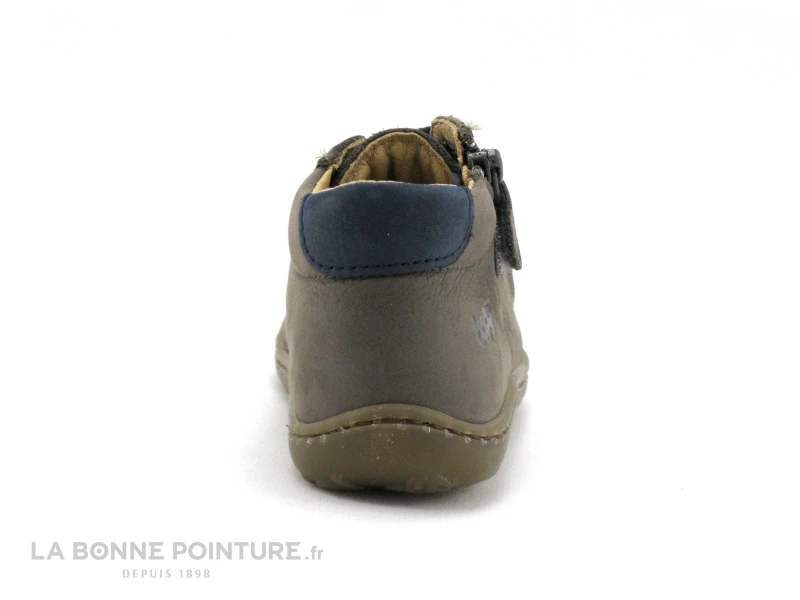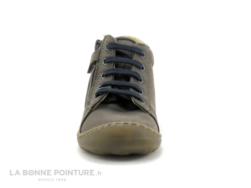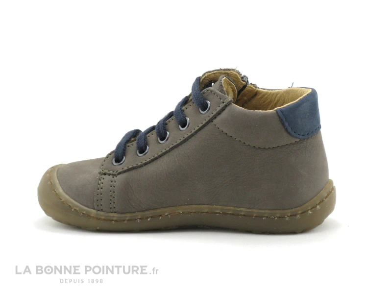 Cette chaussure montante garçon Bopy est en cuir marron taupe aspect peau de pĂŞche, avec une partie bleu marine Ă l’arrière.
