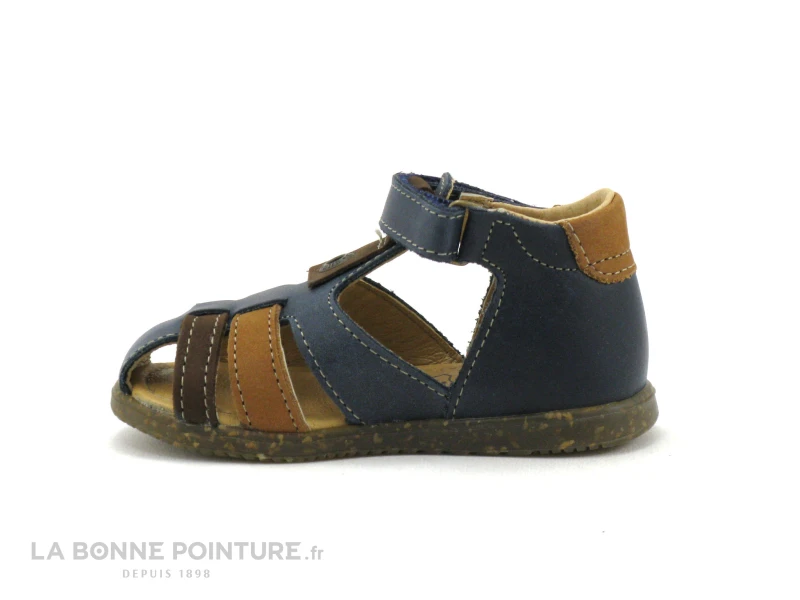 Ce nu-pieds bĂ©bĂ© bout fermĂ© Bopy Radius mĂ©lange harmonieusement cuir bleu marine et cuir marron, couleur chocolat et caramel…
