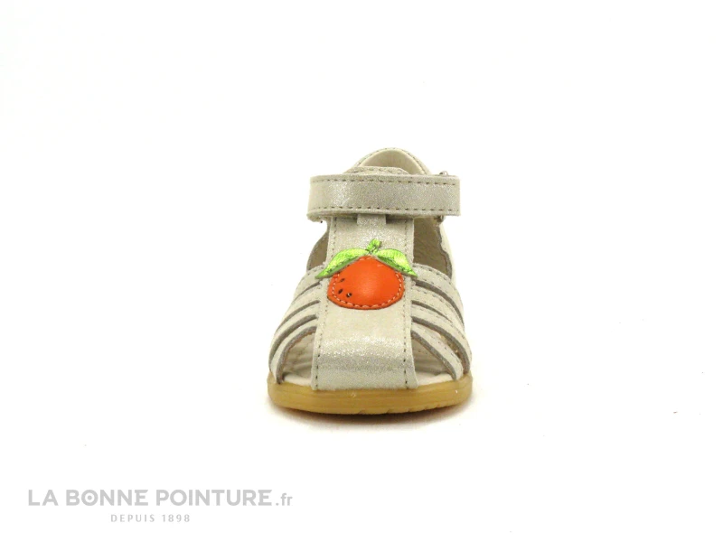 Outre la qualité et le confort, la sandale montante bébé fille Bopy REGALADE propose un look très girly, toute dorée avec un joli fruit orange sur la bride supérieure.