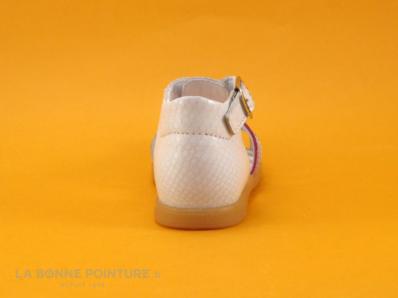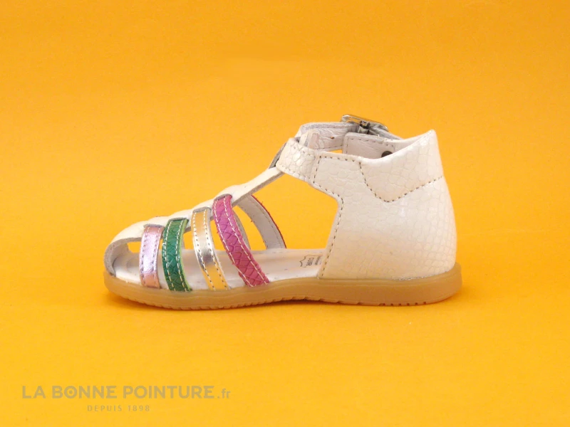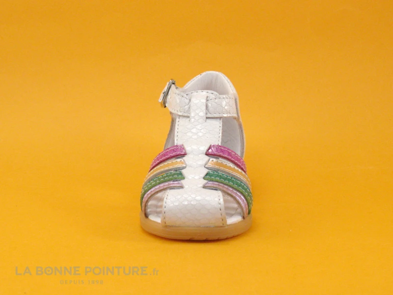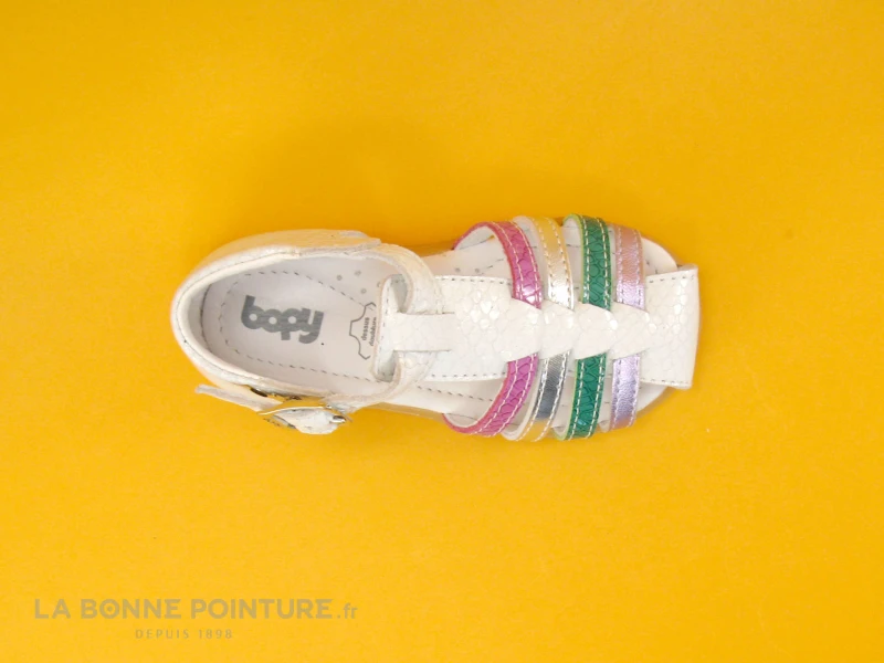Cette sandale bĂ©bĂ© fille Ă bout fermĂ© Bopy Ritola est en cuir blanc verni, avec 4 lanières sur le dessus aux tons de rose, d’argent, de vert et de violet.