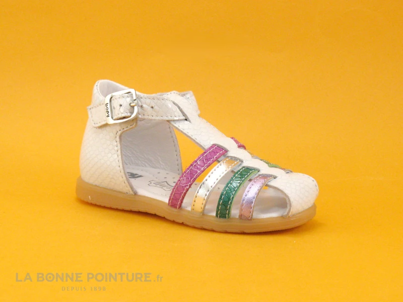 Les nu-pieds fille cuir blanc et multicolore Bopy Ritola, des nu-pieds bébé souples pour votre petite princesse en été au meilleur rapport qualité / prix !