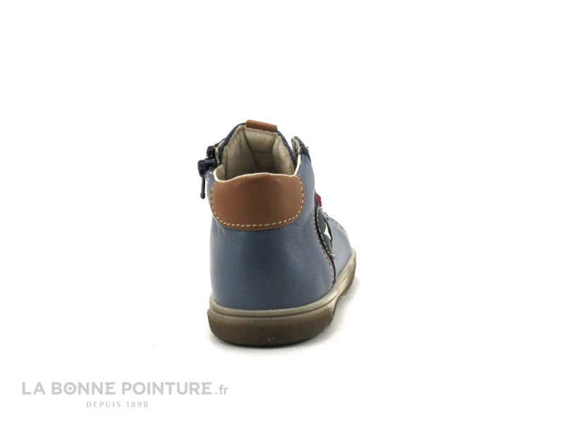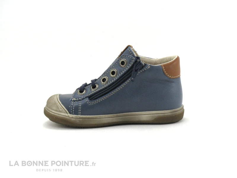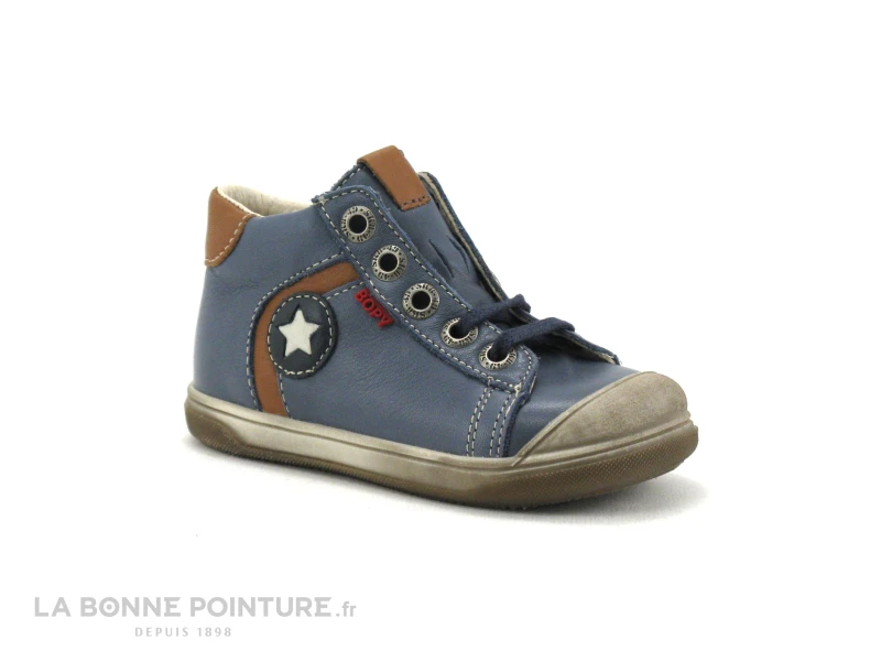 Cette chaussure montante bébé Bopy est en cuir bleu jean, avec une pointe de marron camel et une étoile sur le côté.