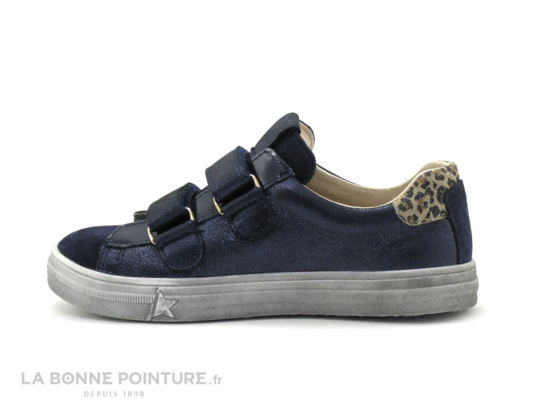 La tige des sneakers bleu marine fille mélange un cuir velours et un cuir brillant métallisé, avec des parties vernies sur le dessus.