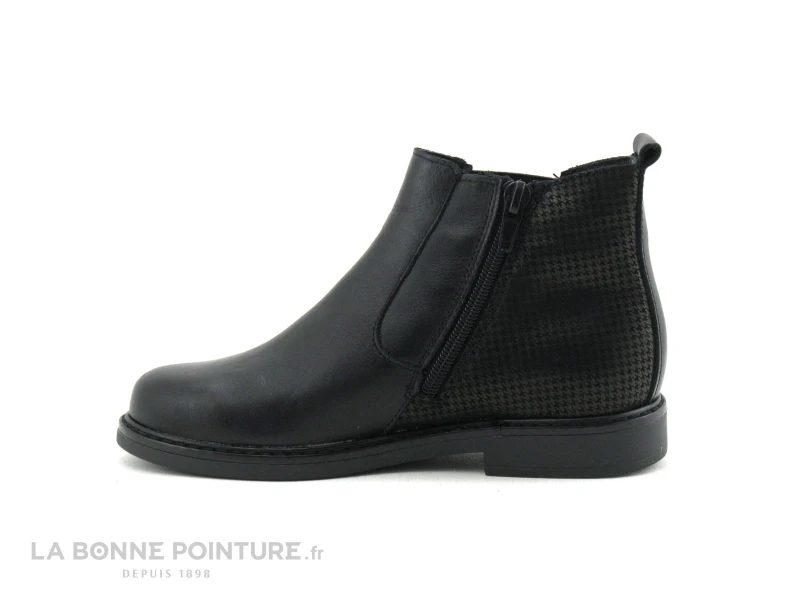 EquipĂ©e d’une fermeture Ă©clair de l’autre cĂ´tĂ©, cette bottine fille noire Bopy Selisou se ferme très facilement.
