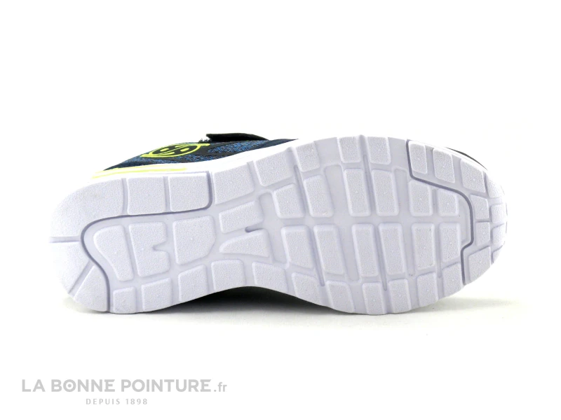 Ces sneakers garçon sont en textile et matières synthĂ©tiques bleu marine, avec du noir sur le devant et l’intĂ©rieur jaune fluo.