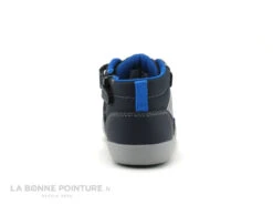 Le pied de l’enfant est confortablement maintenu dans un textile veloutĂ© bleu marine agrĂ©mentĂ© de surpiqĂ»res grises et bleues.