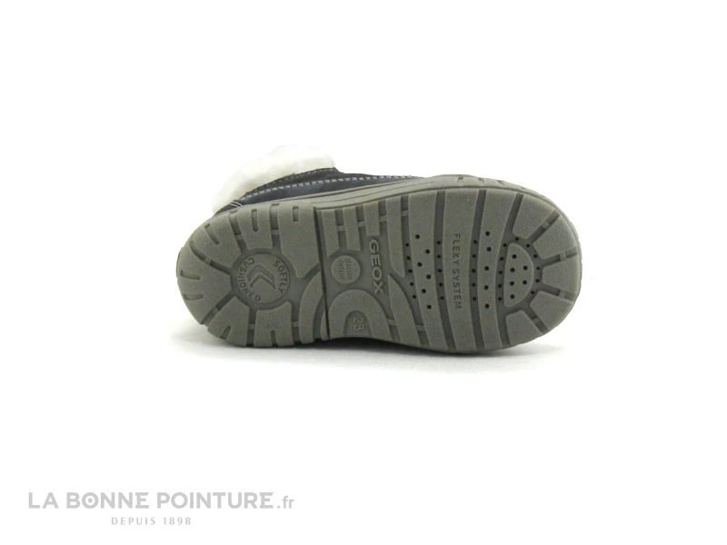 La doublure des boots bébé Geox Omar est en fourrure épaisse façon laine de mouton, et la semelle de propreté est en textile molletonné.