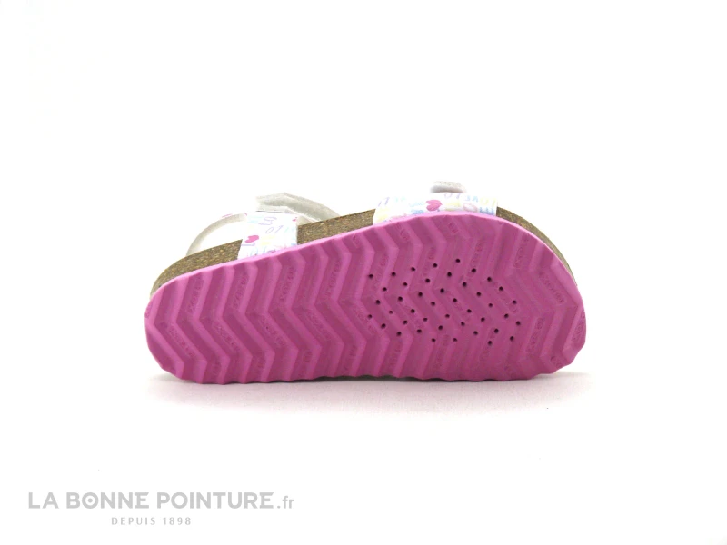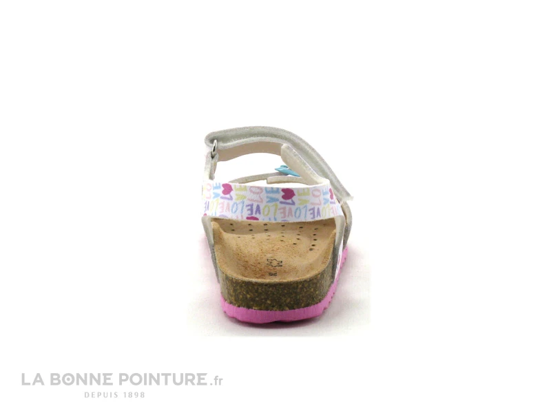 Cette sandale bébé fille Geox est blanche imprimée « Love » en lettres multicolores, avec des petits coeurs fuchsia.