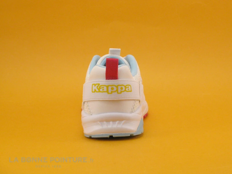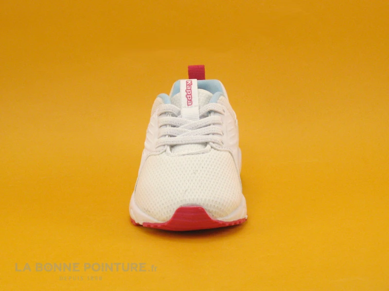 Cette chaussure de sport Kappa SanPuerto est en textile et matières synthĂ©tiques blancs, avec un peu de bleu turquoise et de rose fuchsia. Le large Ă©lastique blanc Ă l’arrière des sneakers est marquĂ© Kappa en jaune.