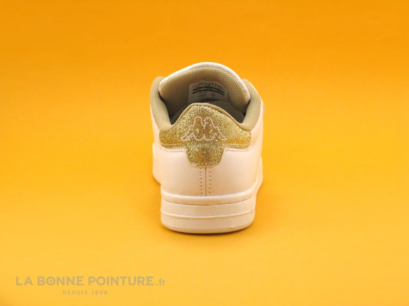 Le logo et l’inscription Kappa s’affichent sur le cĂ´tĂ© de la chaussure en dorĂ©, et Ă l’arrière de la basket en blanc.