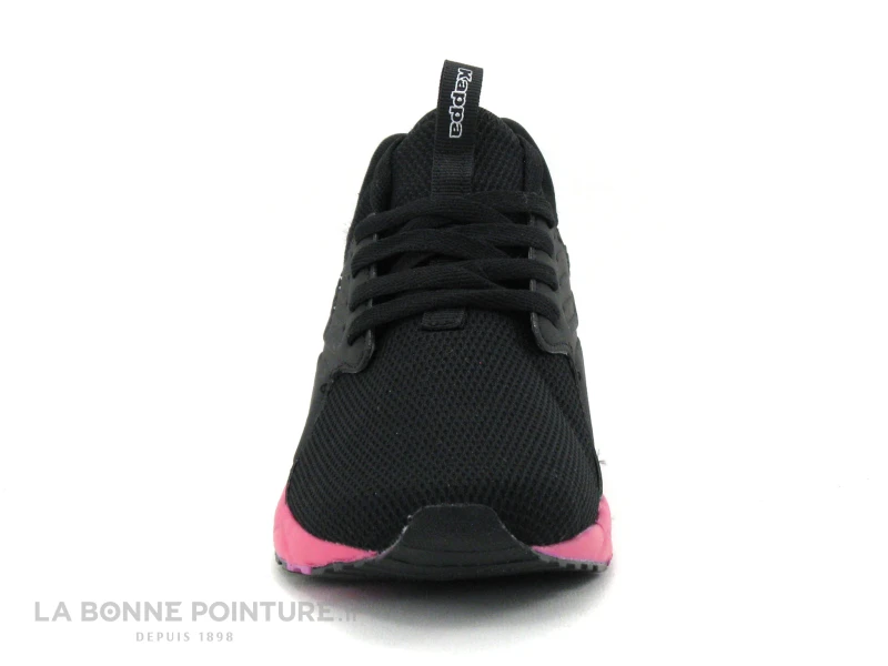 Cette basket slip-on fille ou Femme Kappa est en tissu maille et matières synthétiques noirs, avec la semelle qui flashe en rose fuchsia et violet.