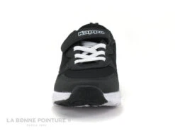 Un Ă©lastique noir est fixĂ© Ă l’arrière de la chaussure de sport fille, marquĂ© Kappa en lettres argentĂ©es.