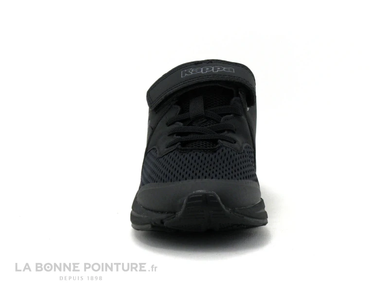 Cette chaussure de running enfant Kappa est en tissu maille et matières synthétiques résistantes noir et gris foncé.
