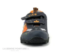 Cette chaussure clignotante enfant Lico Pirate V Blinky sur le thème pirate est en textile, aux tons marine, orange, noir et blanc.