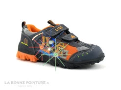 Cette chaussure clignotante enfant Lico Pirate V Blinky sur le thème pirate est en textile, aux tons marine, orange, noir et blanc.