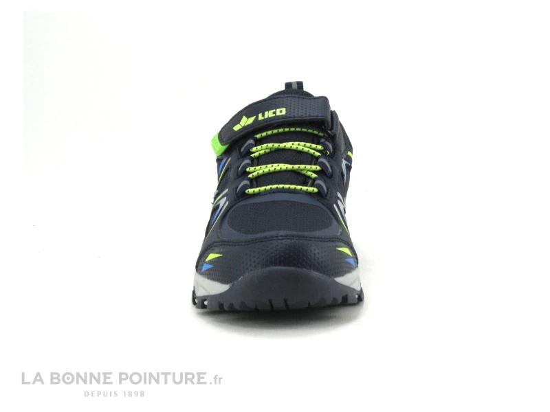 Ces baskets enfant Lico Allen sont en textile et matières synthétiques résistants bleu marine, avec un peu de bleu turquoise et de vert lime.