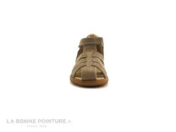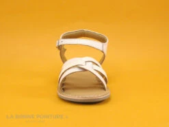Ce nu-pied enfant Minibel est en cuir argenté, avec des lanières fantaisie en cuir velours sur le devant.
