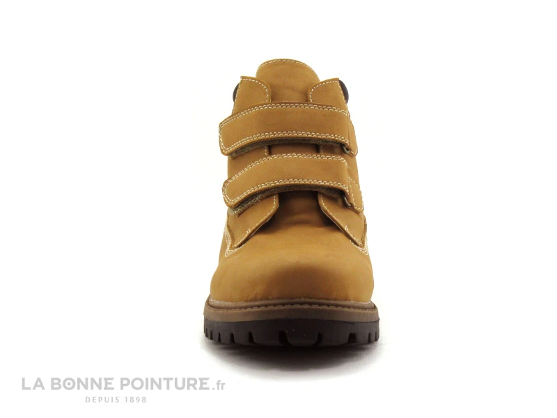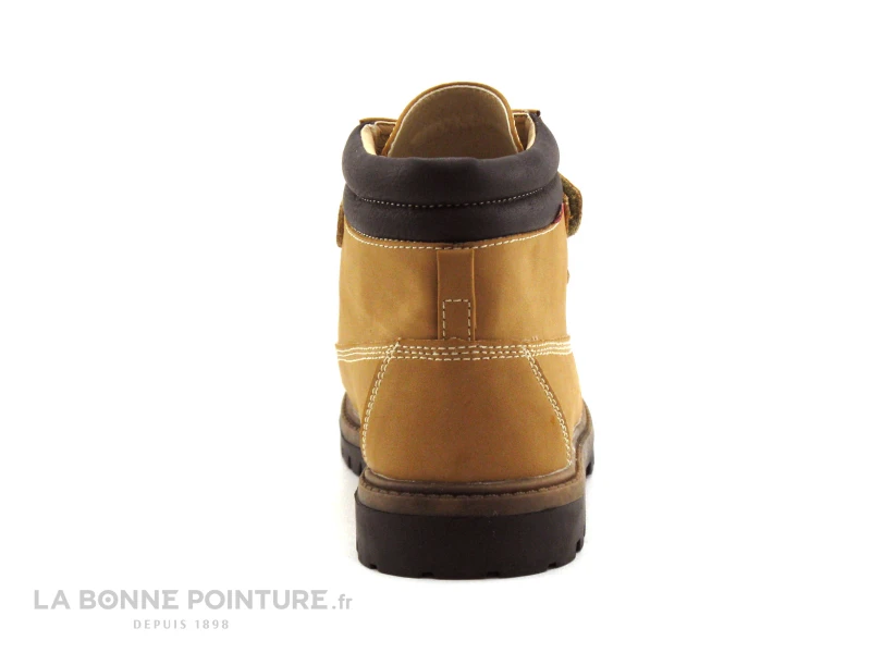Cette chaussure montante enfant est en simili cuir camel / jaune gold, avec l’encolure noire et matelassĂ©e.