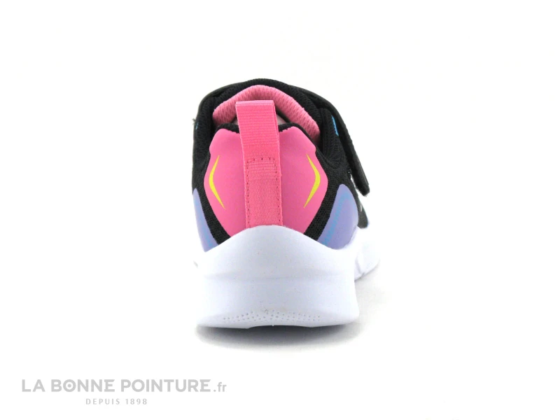Cette belle basket fillette Skechers est en textile et matières synthétiques, aux tons de noir, de rose, de violet et de turquoise.