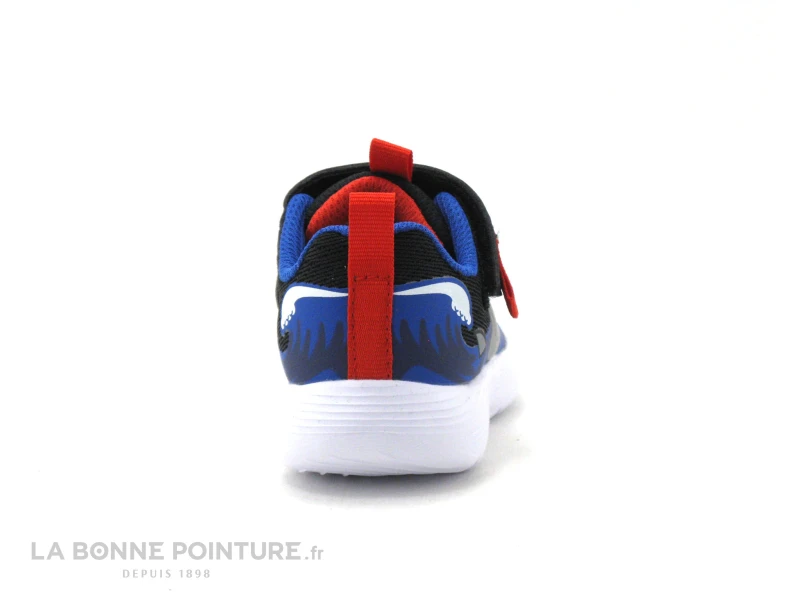 Cette basket bébé lavable en machine Skechers Shark Wave est en textile et matières synthétiques résistantes, aux tons de noir, de bleu et de rouge.