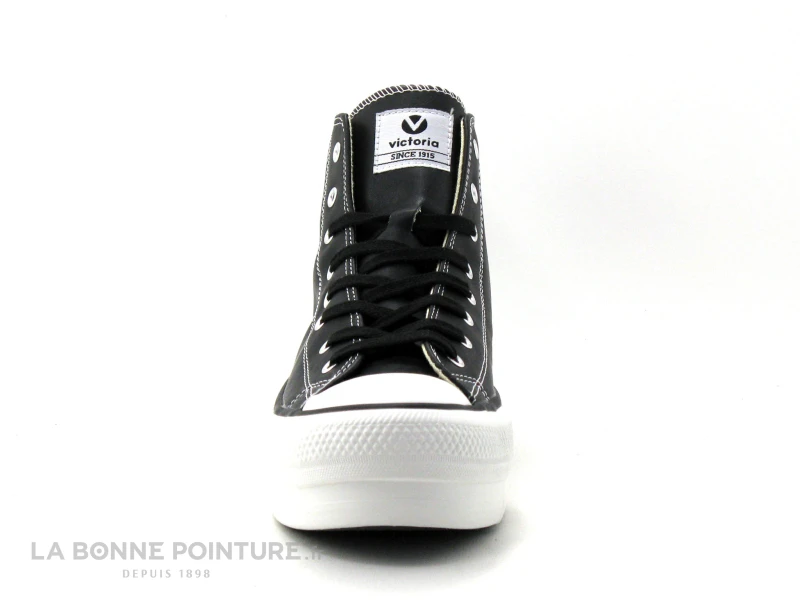 Cette basket montante Victoria 061107 à semelle compensée est en simili cuir noir, avec retour en caoutchouc blanc sur la pointe.