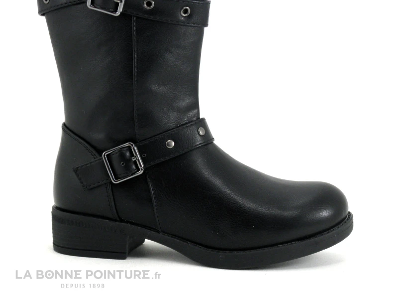 Cette botte fille Wipop est en simili cuir noir aspect veinĂ©, avec des lanières ornĂ©es de clous et d’oeillets argentĂ©s.