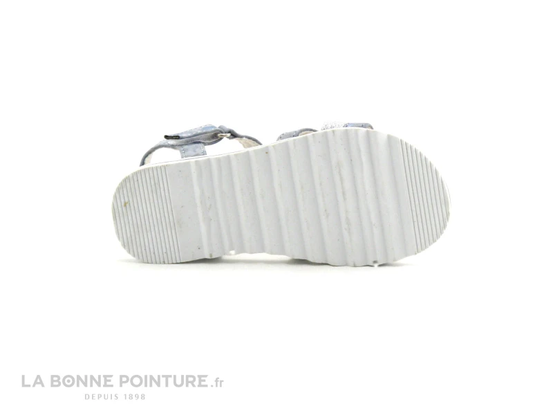 Ce nu-pieds enfant Wipop est bleu ciel métallisé et nuancé de gris, avec une lanière argent pailleté et une autre perforée de petits coeurs.