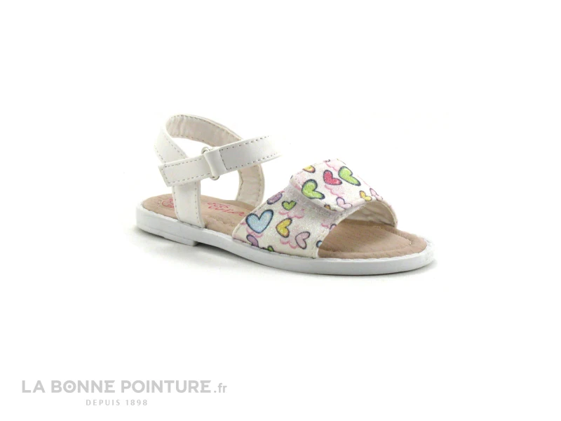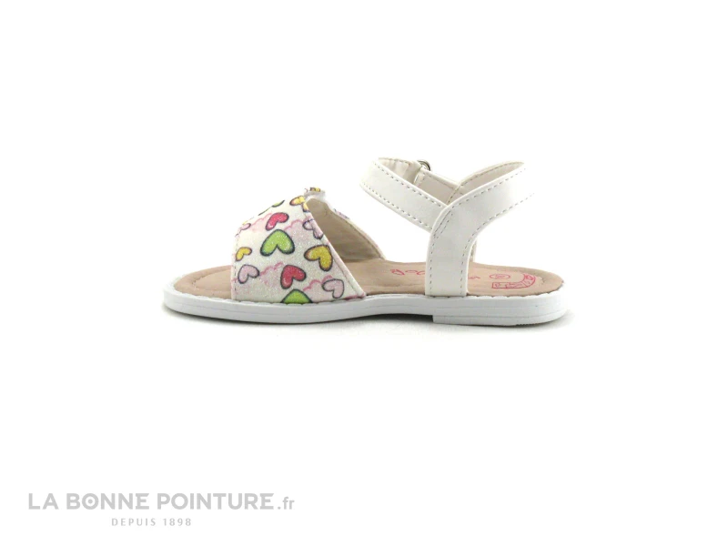 Ce nu-pieds enfant est blanc, avec la bride avant pailletée imprimée petits coeurs multicolores.